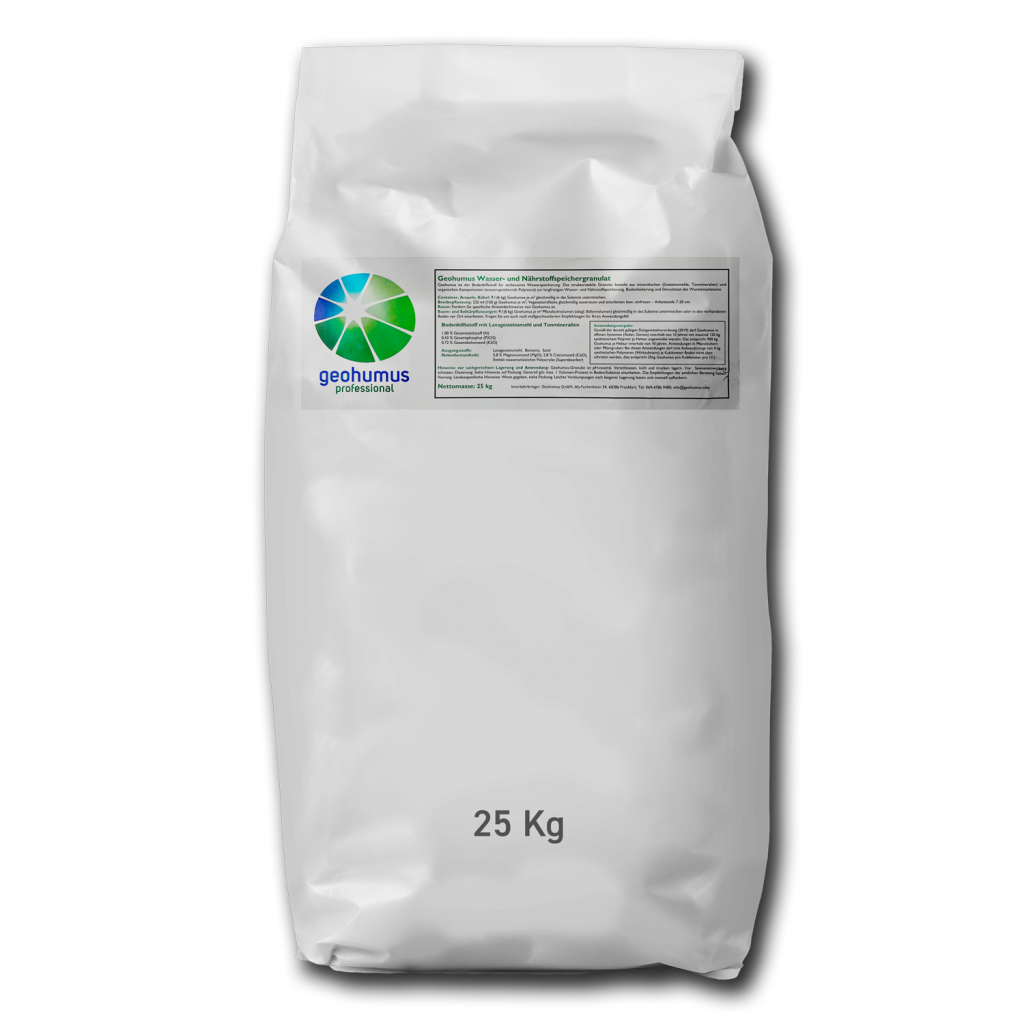Geohumus, das innovative Wasser- und Nähstoffspeichergranulat ist ein Bodenhilfsstoff, der ein bis zu 40-faches Wasserhaltevermögen im Boden ermöglicht. D. h. es muss bis zu 30% weniger bewässert werden. Auch können Pflanzen Trockenperioden viel besser überstehen.